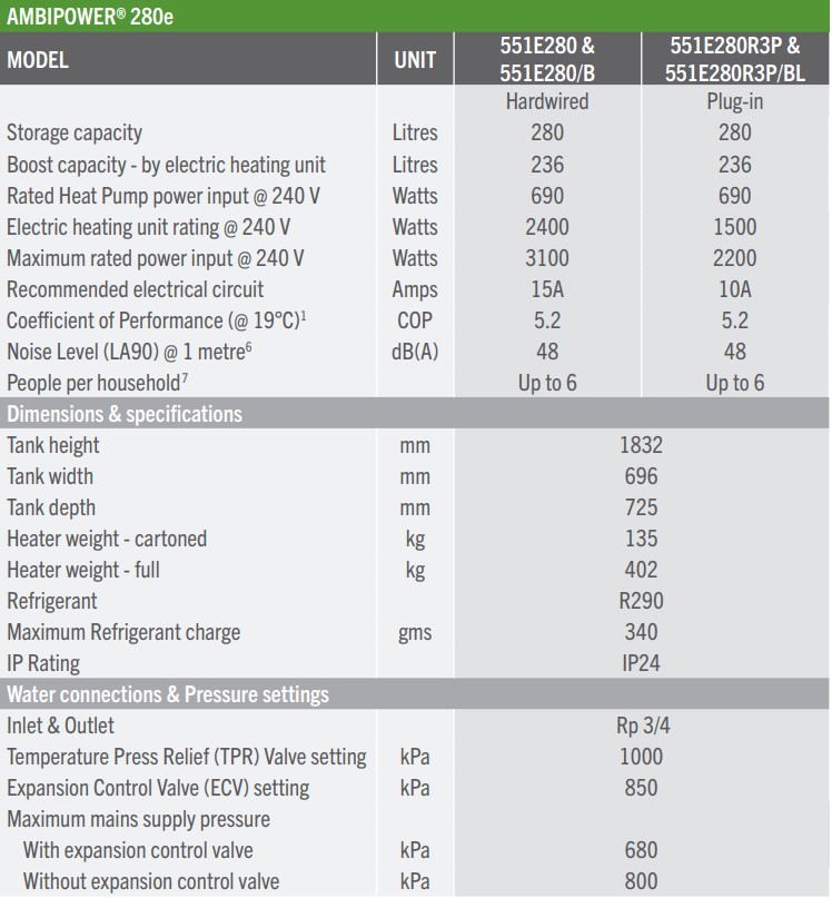 The AmbiPower® 280e is a Low GWP (Global Warming Potential) R290 refrigerant 280 litre Heat Pump – great for replacement of an electric water heater. AmbiPower 280e is an energy efficient alternative for areas where a traditional solar water heater may not be suitable. It has a high Coefficient of Performance (COP) of 5.2. With its advanced wrap around microchannel heating technology for uniform and faster water heating the AmbiPower 280e is suitable for harsh water conditions; and cold climates (with an operating range from -6°C) to higher ambient temperatures.